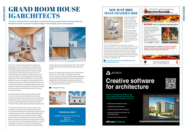 The site is located on the edge of a residential development surrounded by a rural landscape, facing both a busy road and a private lane, with the design taking advantage of the spaciousness and openness offered by the large site and its surrounding environment to create a bright and expansive space. The building consists of a single large space called the Grand Room, around which private rooms are arranged. Occupying half of the building ' s total area, the Grand Room functions as a living room, dining room, hallway, play area for the children, and even as a garden. Its usage can change flexibly, guided by the overhead beams running through the space.