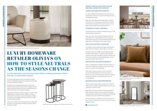 In addition to its premium furniture collections, Olivia’ s offers a personalised interior design service and is showing homeowners how to add interest to neutral interiors as the seasons change.