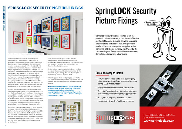 The Springlock concealed security fixing was developed by a company with many years of experience installing pictures in hotels, pubs, clubs & restaurants. Frustrated by the shortcomings of existing hanging devices, the Directors decided it was time for picture installation to evolve & they began engineering an entirely new concept. This was designed & created by brothers John & Roger Hough, formally of Ovolo Designs Ltd, based in Barnet, North London. They patented the idea and worked tirelessly on business development immediately afterwards. It took extensive effort to develop the Springlock branding without the power of the internet. No webpages to explain how it worked, no email to connect with potential customers and no social media to spread awareness of the product.