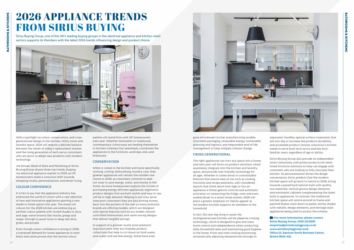 Sirius Buying Group, one of the UK’ s leading buying groups in the electrical appliance and kitchen retail sectors supports its Members with the latest 2026 trends influencing design and product choice.