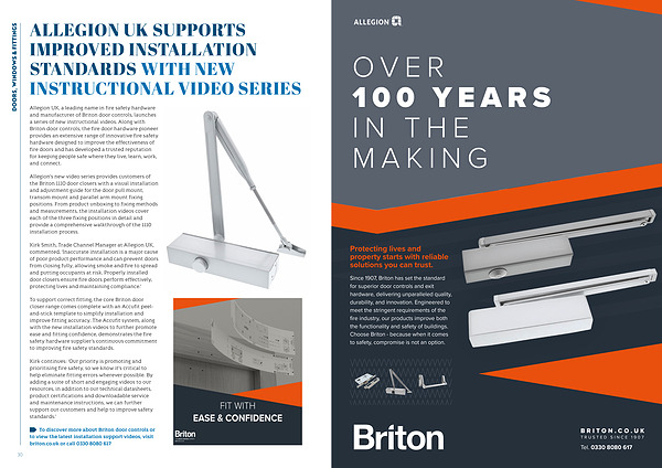 To support correct fitting, the core Briton door closer range comes complete with an Accufit peeland-stick template to simplify installation and improve fitting accuracy. The Accufit system, along with the new installation videos to further promote ease and fitting confidence, demonstrates the fire safety hardware supplier’ s continuous commitment to improving fire safety standards.
