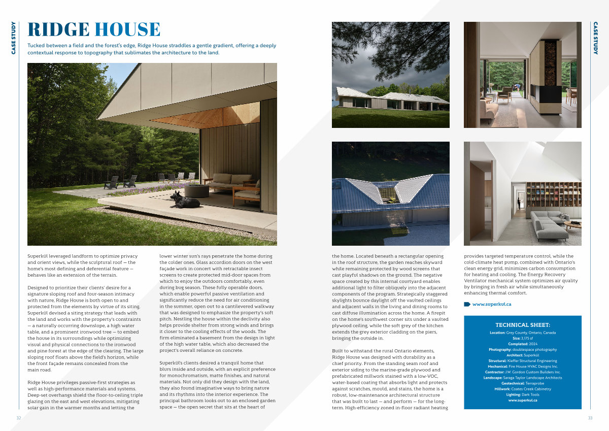 Location: Grey County, Ontario, Canada Size: 3,175 sf Completed: 2024 Photography: doublespace photography Architect: Superkül Structural: Kieffer Structural Engineering Mechanical: Fire House HVAC Designs Inc. Contractor: J. W. Gordon Custom Builders Inc. Landscape: Saraga Taylor Landscape Architects Geotechnical: Terraprobe Millwork: Coates Creek Cabinetry Lighting: Dark Tools www. superkul. ca