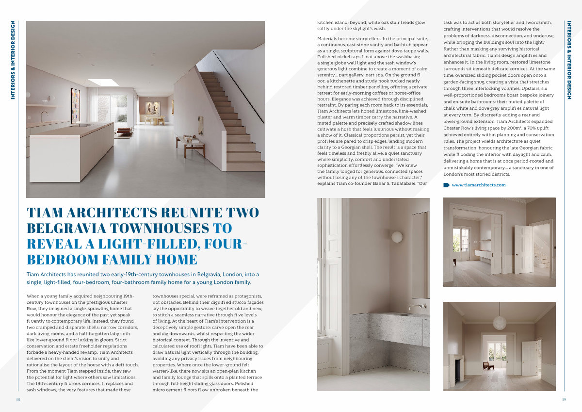 task was to act as both storyteller and swordsmith, crafting interventions that would resolve the problems of darkness, disconnection, and underuse, while bringing the building’ s soul into the light.” Rather than masking any surviving historical architectural fabric, Tiam’ s design amplifi es and enhances it. In the living room, restored limestone surrounds sit beneath delicate cornices. At the same time, oversized sliding pocket doors open onto a garden-facing snug, creating a vista that stretches through three interlocking volumes. Upstairs, six well-proportioned bedrooms boast bespoke joinery and en-suite bathrooms; their muted palette of chalk white and dove grey amplifi es natural light at every turn. By discreetly adding a rear and lower-ground extension, Tiam Architects expanded Chester Row’ s living space by 200m ²; a 70 % uplift achieved entirely within planning and conservation rules. The project wields architecture as quiet transformation: honouring the late Georgian fabric while fl ooding the interior with daylight and calm, delivering a home that is at once period-rooted and unmistakably contemporary … a sanctuary in one of London’ s most storied districts.