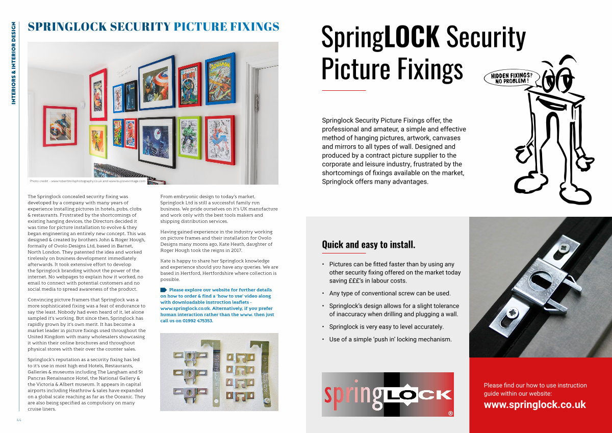 Springlock Security Picture Fixings offer, the professional and amateur, a simple and effective method of hanging pictures, artwork, canvases and mirrors to all types of wall. Designed and produced by a contract picture supplier to the corporate and leisure industry, frustrated by the shortcomings of fixings available on the market, Springlock offers many advantages.