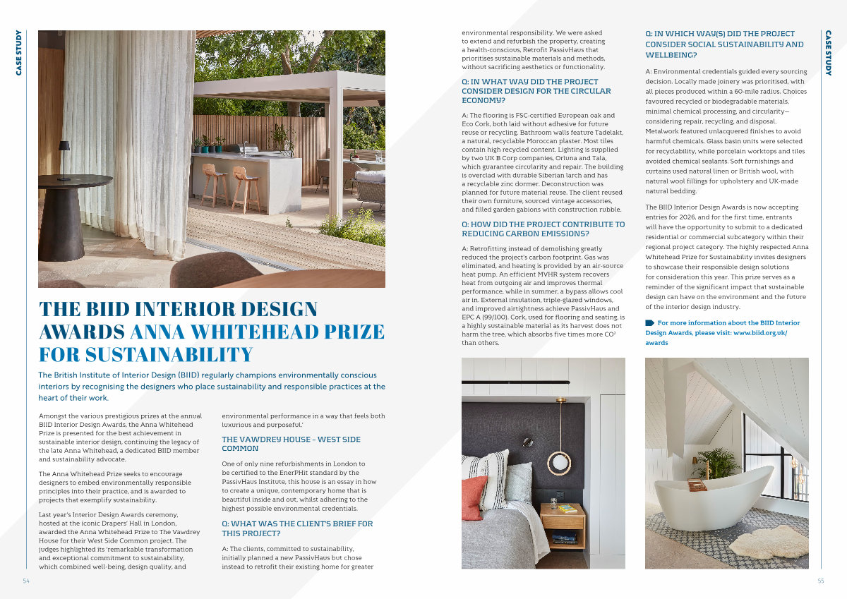 The BIID Interior Design Awards is now accepting entries for 2026, and for the first time, entrants will have the opportunity to submit to a dedicated residential or commercial subcategory within their regional project category. The highly respected Anna Whitehead Prize for Sustainability invites designers to showcase their responsible design solutions for consideration this year. This prize serves as a reminder of the significant impact that sustainable design can have on the environment and the future of the interior design industry.