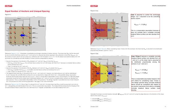 • The applied shear load( V ua) is assumed to act on col 1, col 2 and col 3; however, any load acting on col 2 will be redistributed to col 1 because the concrete failure surface for col 2 is assumed to merge with that of col 1. One possible design assumption would be that the total shear load acts only on col 1. This is a conservative interpretation of ACI 318 provisions. An alternate design assumption would be that the shear load is distributed between col 1 and col 3 since a complete failure surface can develop from both columns. This is a reasonable interpretation of ACI 318 provisions. The design engineer must determine how to best interpret ACI 318 provisions for their anchoring application. See page 10 for more information.