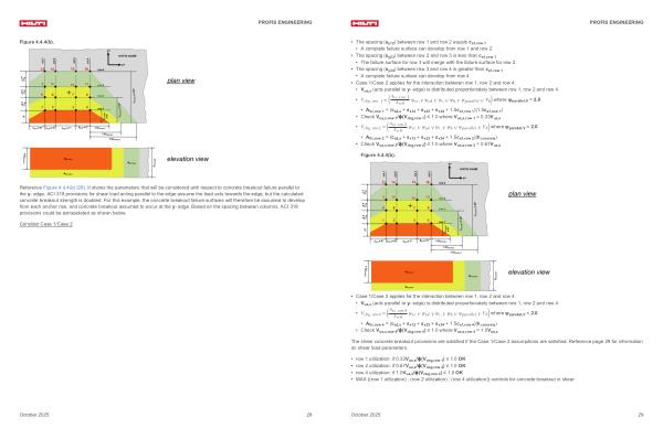 Figure 4.4.4( b) [ 28 ]. It shows the parameters that will be considered with respect to concrete breakout failure parallel to the y- edge. ACI 318 provisions for shear load acting parallel to the edge assume the load acts towards the edge, but the calculated concrete breakout strength is doubled. For this example, the concrete breakout failure surfaces will therefore be assumed to develop from each anchor row, and concrete breakout assumed to occur at the y- edge. Based on the spacing between columns, ACI 318 provisions could be extrapolated as shown below.