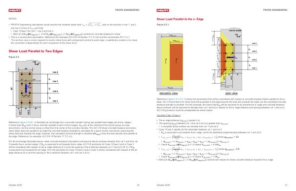 Reference Figure 4.5.1 [ 31 ]. It shows the parameters that will be considered with respect to concrete breakout failure parallel to the x- edge. ACI 318 provisions for shear load acting parallel to the edge assume the load acts towards the edge, but the calculated concrete breakout strength is doubled. For this example, the shear load V ua will be assumed to act towards the x- edge and concrete breakout failure surfaces will be assumed to develop from col 1 and col 2. Based on the x- edge distance and spacing between col 1 and col 2, ACI 318 provisions could be extrapolated as shown below.
