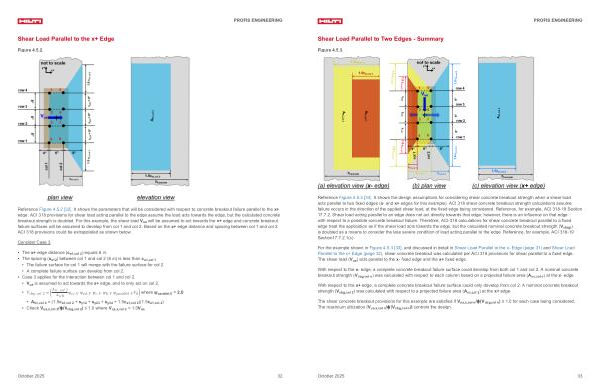 For the example shown in Figure 4.5.3 [ 33 ], and discussed in detail in Shear Load Parallel to the x- Edge( page 31) and Shear Load Parallel to the x + Edge( page 32), shear concrete breakout was calculated per ACI 318 provisions for shear parallel to a fixed edge. The shear load( V ua) acts parallel to the x- fixed edge and the x + fixed edge.
