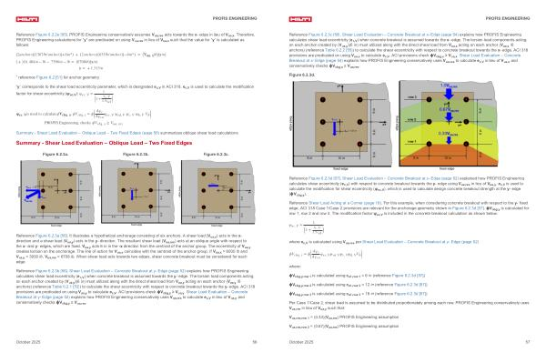 Reference Figure 6.2.3c [ 56 ]. Shear Load Evaluation – Concrete Breakout at x- Edge( page 54) explains how PROFIS Engineering calculates shear load eccentricity( e c, V) when concrete breakout is assumed towards the x- edge. The torsion load components acting on each anchor created by( V ua, y)( 6 in) must utilized along with the direct shear load from V ua, x acting on each anchor( V ua, x / 6 anchors)( reference Table 6.2.2 [ 55 ]) to calculate the shear eccentricity with respect to concrete breakout towards the x- edge. ACI 318 provisions are predicated on using V ua, x to calculate e c, V. ACI provisions check ϕV cbg, x ≥ V ua, x. Shear Load Evaluation – Concrete Breakout at x- Edge( page 54) explains how PROFIS Engineering conservatively uses V ua, res to calculate e c, V in lieu of V ua, x and conservatively checks ϕV cbg, x ≥ V ua, res.