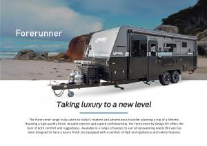 The Forerunner range truly caters to today ’ s modern and adventurous traveller planning a trip of a lifetime . Boasting a high-quality finish , durable exterior and superb craftsmanship , the Forerunner by Design RV offers the best of both comfort and ruggedness . Available in a range of layouts to suit all caravanning needs this van has been designed to have a luxury finish , be equipped with a number of high end appliances and safety features .