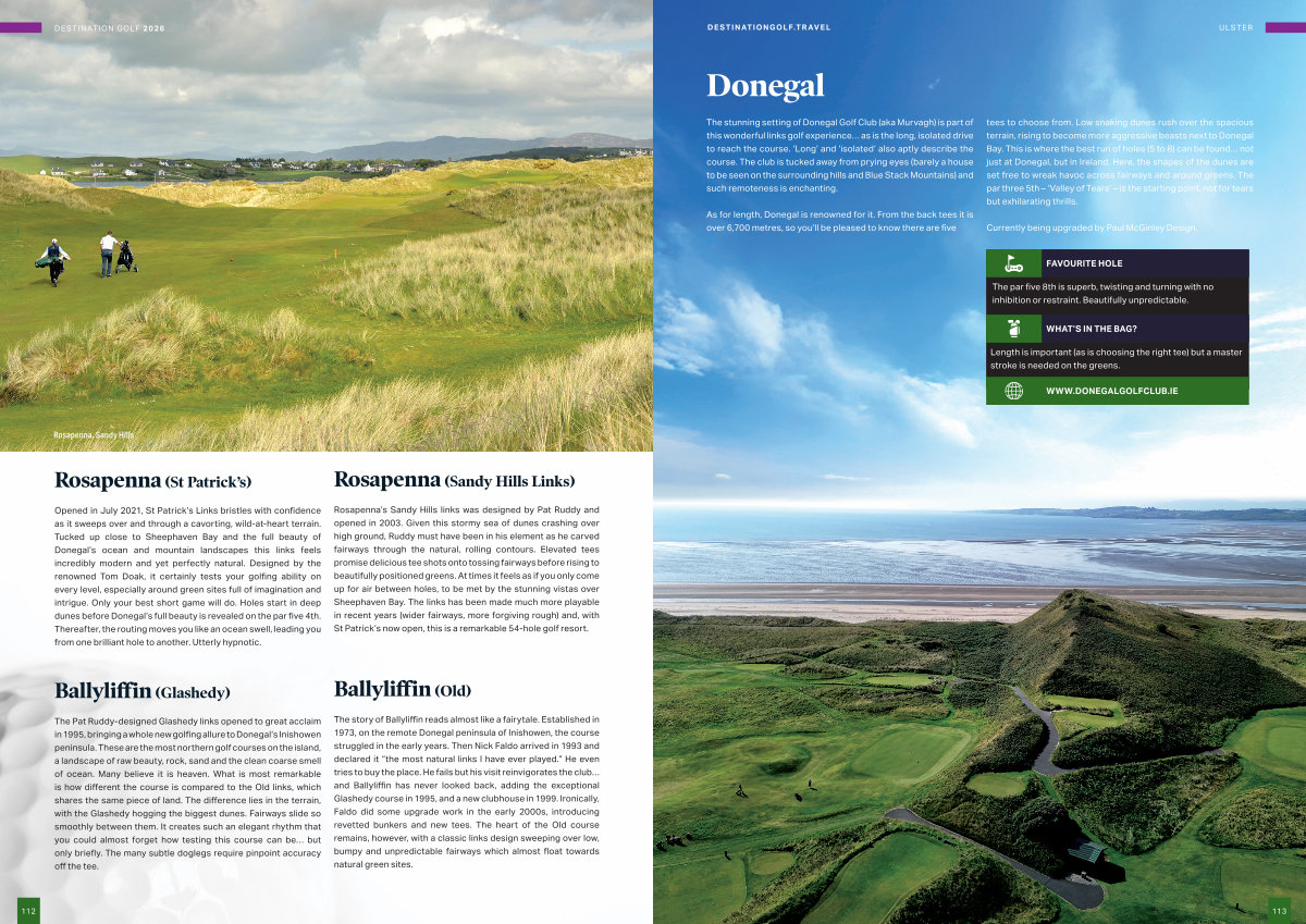 As for length, Donegal is renowned for it. From the back tees it is over 6,700 metres, so you’ ll be pleased to know there are five tees to choose from. Low snaking dunes rush over the spacious terrain, rising to become more aggressive beasts next to Donegal Bay. This is where the best run of holes( 5 to 8) can be found … not just at Donegal, but in Ireland. Here, the shapes of the dunes are set free to wreak havoc across fairways and around greens. The par three 5th –‘ Valley of Tears’ – is the starting point, not for tears but exhilarating thrills.