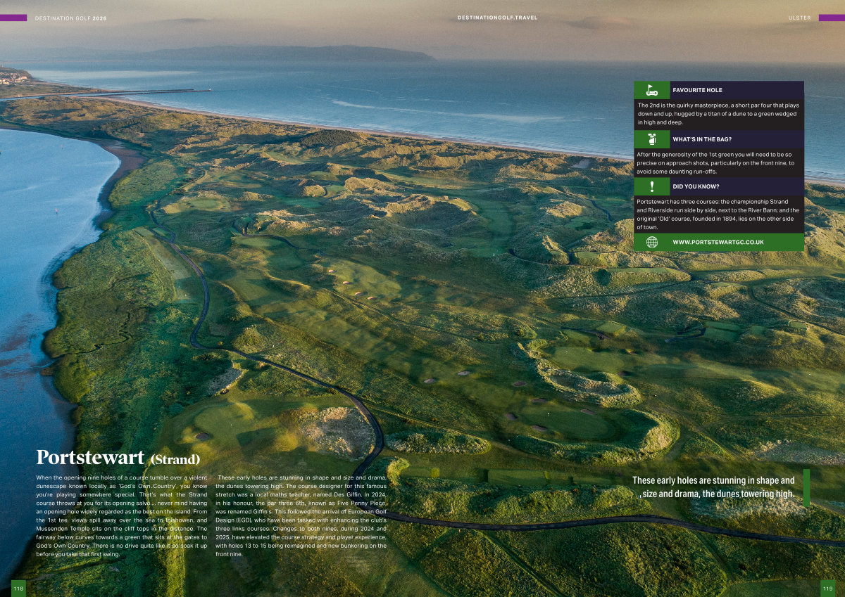 Portstewart has three courses: the championship Strand and Riverside run side by side, next to the River Bann; and the original‘ Old’ course, founded in 1894, lies on the other side of town.