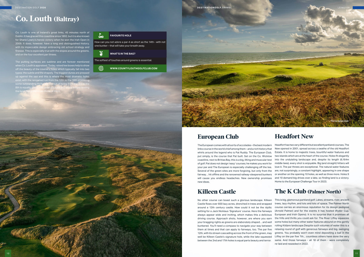 The European comes with all sorts of accolades – the best modern links course in the world chief among them – and a rich history that whirls around the legend who is Pat Ruddy. The European Club, put simply, is the course that Pat built. Set on the Co. Wicklow coastline, next to Brittas Bay, this is a big, lilting and muscular test of golf. Pat does not design‘ easy’ courses; he makes you work for your par and The European is especially challenging off the tee. Several of the green sites are more forgiving, but only from the fairway … hit offline and the renowned railway-sleepered bunkers will cause you endless headaches. New ownership promises new ideas.