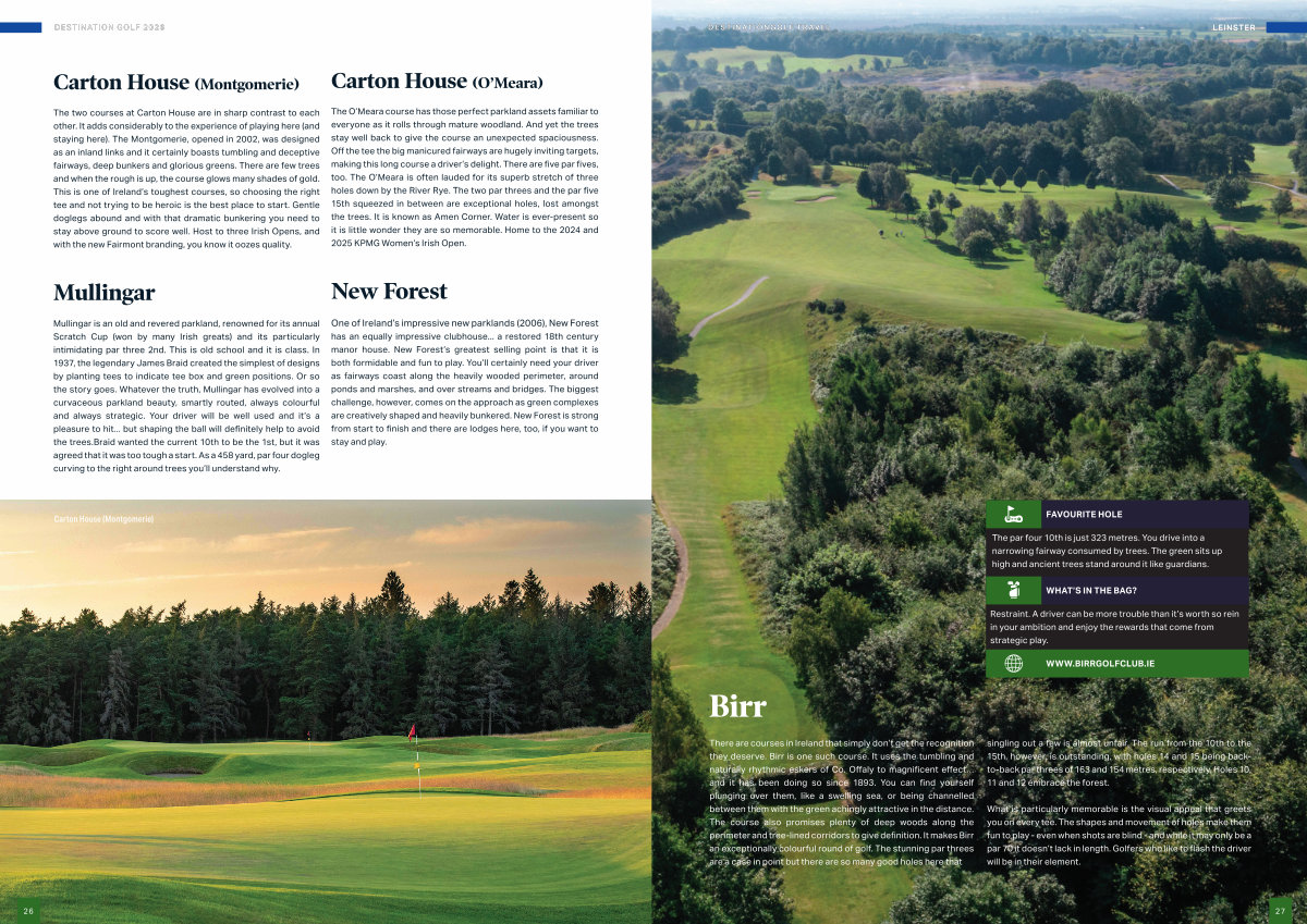 The O’ Meara course has those perfect parkland assets familiar to everyone as it rolls through mature woodland. And yet the trees stay well back to give the course an unexpected spaciousness. Off the tee the big manicured fairways are hugely inviting targets, making this long course a driver’ s delight. There are five par fives, too. The O’ Meara is often lauded for its superb stretch of three holes down by the River Rye. The two par threes and the par five 15th squeezed in between are exceptional holes, lost amongst the trees. It is known as Amen Corner. Water is ever-present so it is little wonder they are so memorable. Home to the 2024 and 2025 KPMG Women’ s Irish Open.