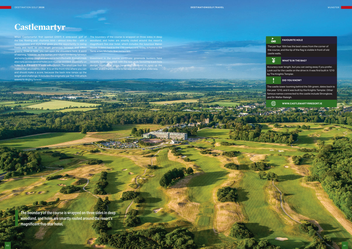 When Castlemartyr first opened( 2007) it embraced golf of the low, flowing and rhythmic kind – almost links-like – with a spaciousness and style that gives you the opportunity to swing freely and hard, as you target generous fairways and silken greens. Draw or fade, you can open the shoulders here. A word of warning, however, as the bumps and ridges bordering fairways are home to deep rough and are not to be trifled with. A small creek also runs across several holes and must be avoided, especially on holes 2, 4, 7, 8 and 9. It adds extra punch. The short par four 9th makes that abundantly clear. It is on the front nine where you can and should make a score, because the back nine ramps up the length and challenge. It includes the enigmatic par five 11th which seems to dogleg forever.