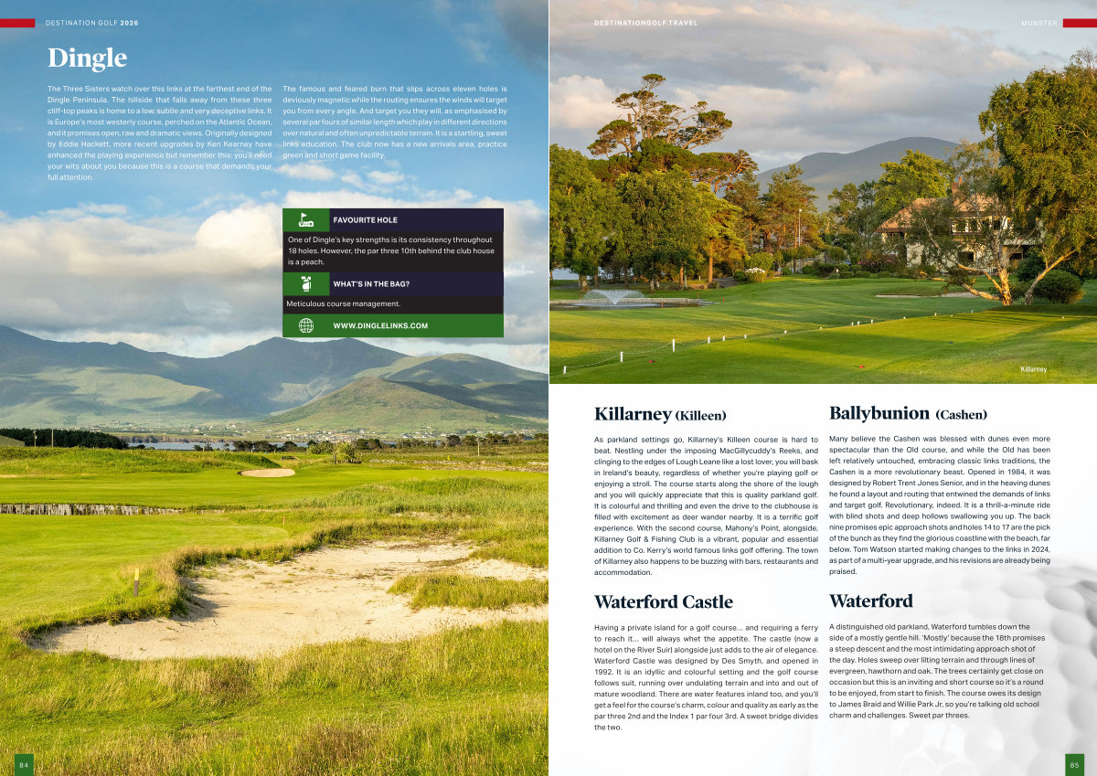 As parkland settings go, Killarney’ s Killeen course is hard to beat. Nestling under the imposing MacGillycuddy’ s Reeks, and clinging to the edges of Lough Leane like a lost lover, you will bask in Ireland’ s beauty, regardless of whether you’ re playing golf or enjoying a stroll. The course starts along the shore of the lough and you will quickly appreciate that this is quality parkland golf. It is colourful and thrilling and even the drive to the clubhouse is filled with excitement as deer wander nearby. It is a terrific golf experience. With the second course, Mahony’ s Point, alongside, Killarney Golf & Fishing Club is a vibrant, popular and essential addition to Co. Kerry’ s world famous links golf offering. The town of Killarney also happens to be buzzing with bars, restaurants and accommodation.