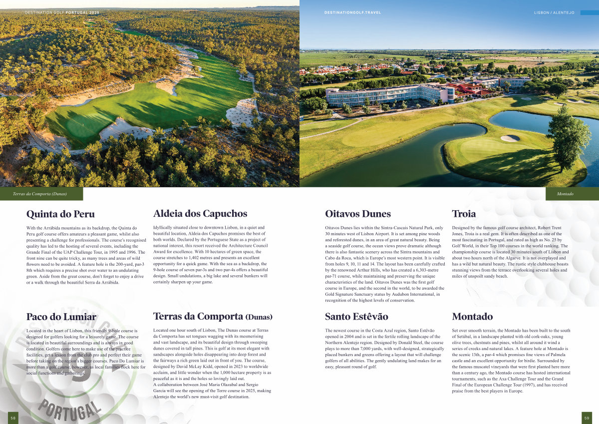 Designed by the famous golf course architect, Robert Trent Jones, Troia is a real gem. It is often described as one of the most fascinating in Portugal, and rated as high as No. 25 by Golf World, in their Top 100 courses in the world ranking. The championship course is located 30 minutes south of Lisbon and about two hours north of the Algarve. It is not overplayed and has a wild but natural beauty. The rustic style clubhouse boasts stunning views from the terrace overlooking several holes and miles of unspoilt sandy beach.
