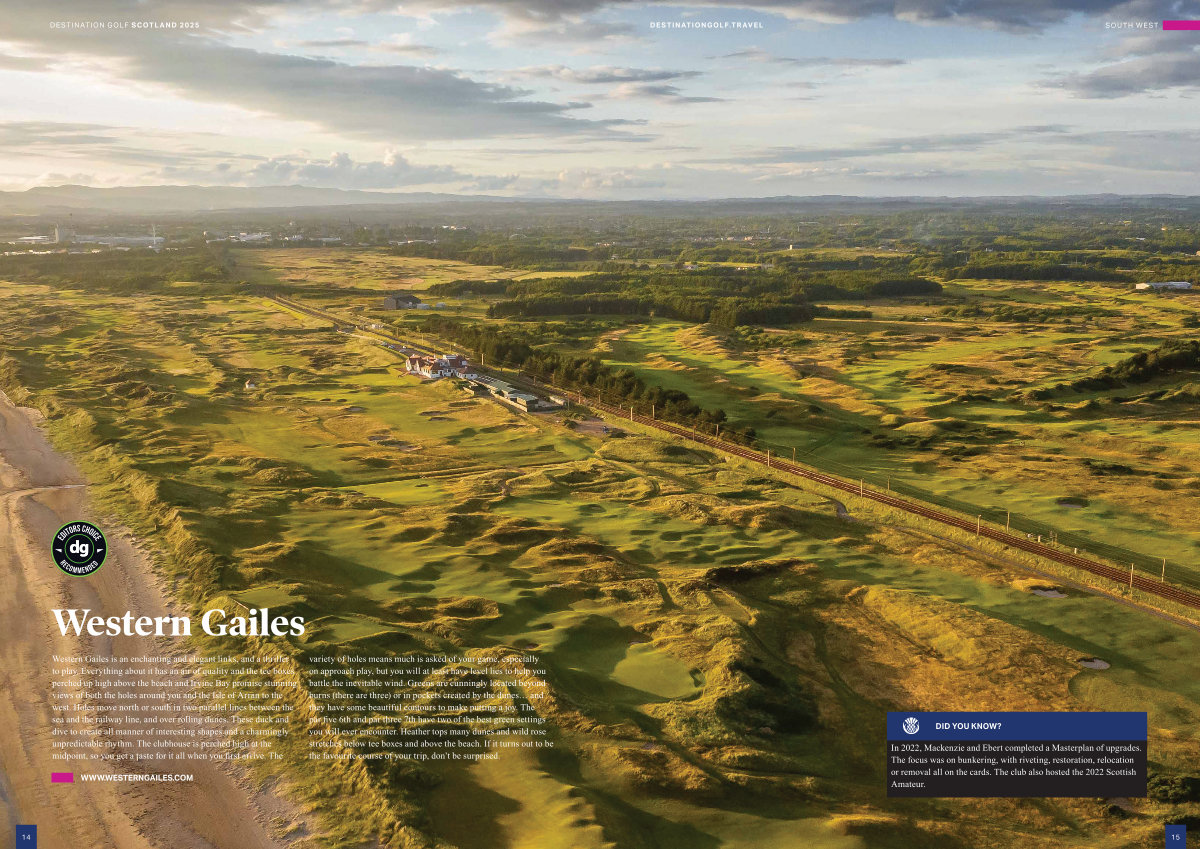 Western Gailes is an enchanting and elegant links , and a thriller to play . Everything about it has an air of quality and the tee boxes perched up high above the beach and Irvine Bay promise stunning views of both the holes around you and the Isle of Arran to the west . Holes move north or south in two parallel lines between the sea and the railway line , and over rolling dunes . These duck and dive to create all manner of interesting shapes and a charmingly unpredictable rhythm . The clubhouse is perched high at the midpoint , so you get a taste for it all when you first arrive . The variety of holes means much is asked of your game , especially on approach play , but you will at least have level lies to help you battle the inevitable wind . Greens are cunningly located beyond burns ( there are three ) or in pockets created by the dunes … and they have some beautiful contours to make putting a joy . The par five 6th and par three 7th have two of the best green settings you will ever encounter . Heather tops many dunes and wild rose stretches below tee boxes and above the beach . If it turns out to be the favourite course of your trip , don ’ t be surprised .