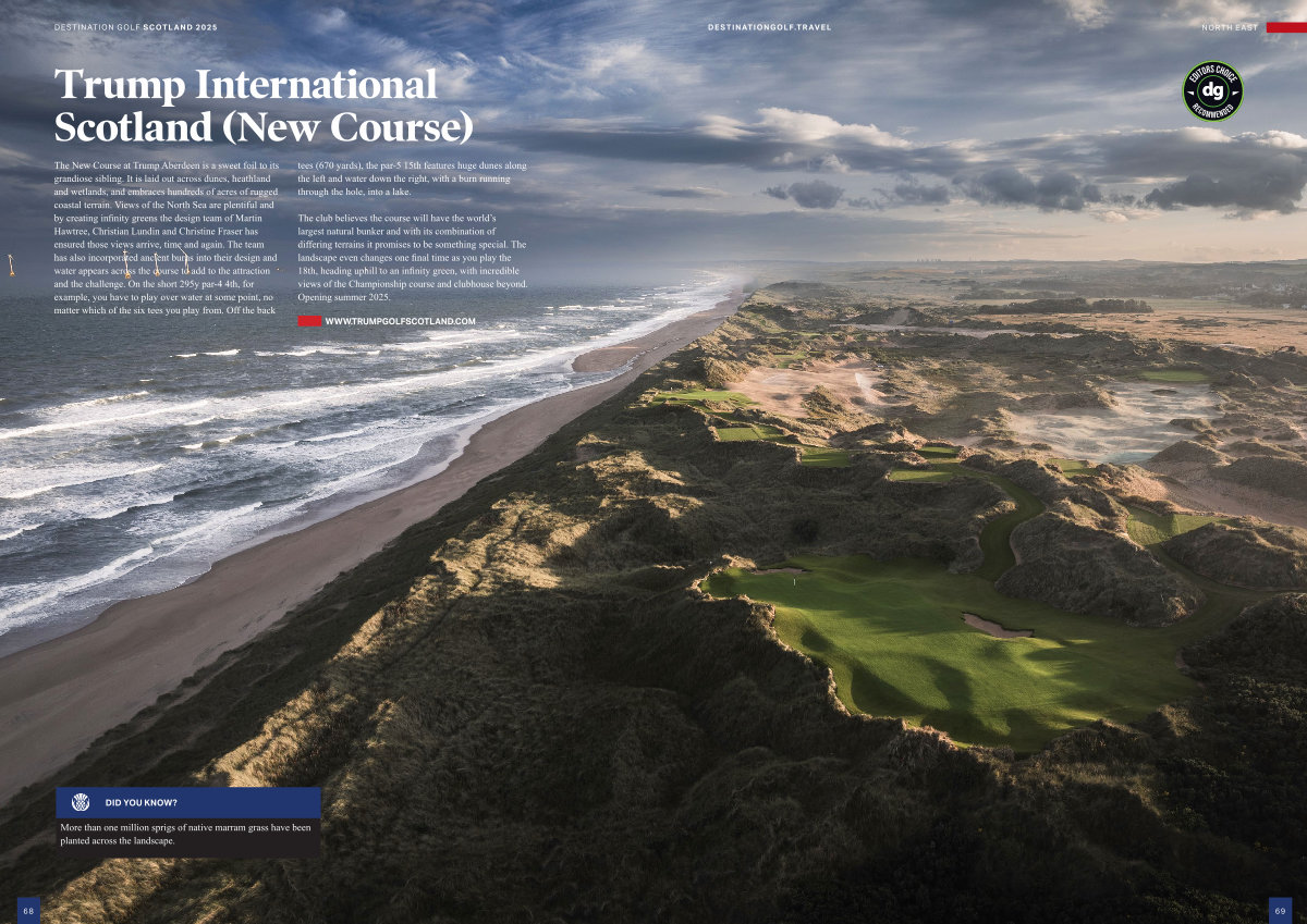 The New Course at Trump Aberdeen is a sweet foil to its grandiose sibling . It is laid out across dunes , heathland and wetlands , and embraces hundreds of acres of rugged coastal terrain . Views of the North Sea are plentiful and by creating infinity greens the design team of Martin Hawtree , Christian Lundin and Christine Fraser has ensured those views arrive , time and again . The team has also incorporated ancient burns into their design and water appears across the course to add to the attraction and the challenge . On the short 295y par-4 4th , for example , you have to play over water at some point , no matter which of the six tees you play from . Off the back tees ( 670 yards ), the par-5 15th features huge dunes along the left and water down the right , with a burn running through the hole , into a lake .