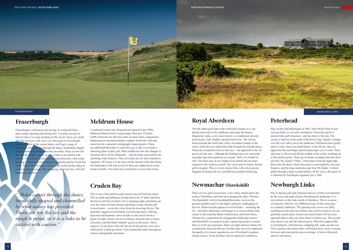 Play in Spring and early Summer and you will be overwhelmed by the scent and sight of gorse drenching the landscape . It is everywhere on this links north of Aberdeen . This is a course of contrasts with two very different loops of nine returning to a modern clubhouse . The opening nine cavort over hilly , rumbling terrain and your balance may just be tested as you are gleefully tossed about . Greens are tiered which will test your approach play as they are often above or below you . The second nine throws you into the densest gorse . What first appears flat is anything but , with fairways whipping left , right , up and over . This is perfect old school links , with blind shots , tricky twisting fairways and some perfect green settings . A links with punch and raw adventure .