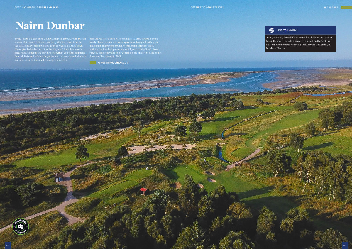 Lying just to the east of its championship neighbour , Nairn Dunbar is over 100 years old . It is a links lying slightly inland from the sea with fairways channelled by gorse as well as pine and birch . These give holes their structure but they can ’ t hide the course ’ s links roots . Certainly the low , twisting terrain embraces traditional Scottish links and let ’ s not forget the pot bunkers , several of which are new . Even so , the small woods promise sweet hole shapes with a burn often coming in to play . There are some lovely characteristics – a lateral spine runs through the 4th green , and natural ridges create blind or semi-blind approach shots , with the par five 18th promising a sticky end . Holes 9 to 11 have recently been renovated to give them a more links feel . Host of the Amateur Championship 2021 .