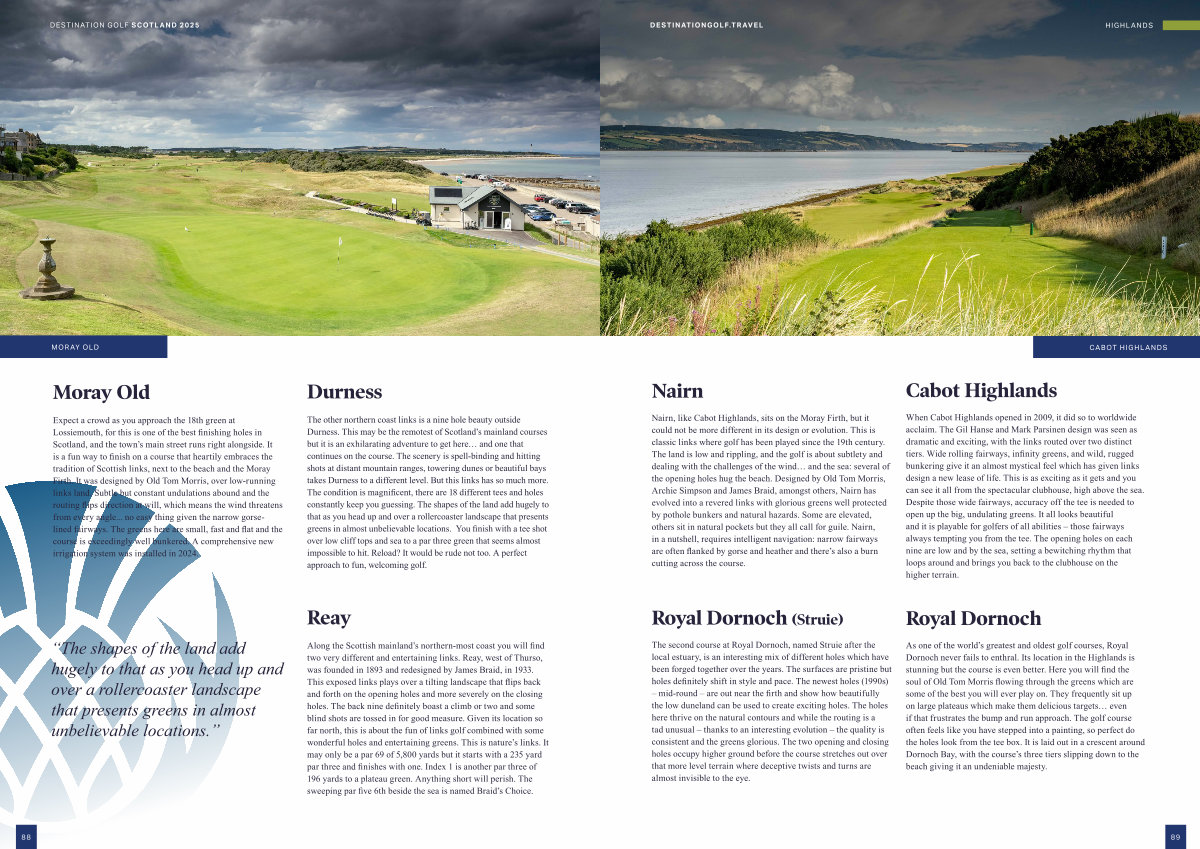 Nairn , like Cabot Highlands , sits on the Moray Firth , but it could not be more different in its design or evolution . This is classic links where golf has been played since the 19th century . The land is low and rippling , and the golf is about subtlety and dealing with the challenges of the wind … and the sea : several of the opening holes hug the beach . Designed by Old Tom Morris , Archie Simpson and James Braid , amongst others , Nairn has evolved into a revered links with glorious greens well protected by pothole bunkers and natural hazards . Some are elevated , others sit in natural pockets but they all call for guile . Nairn , in a nutshell , requires intelligent navigation : narrow fairways are often flanked by gorse and heather and there ’ s also a burn cutting across the course .