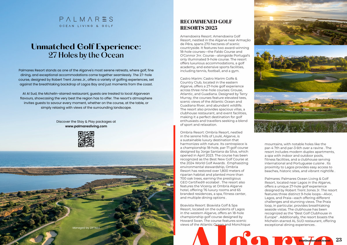 Palmares: Palmares Ocean Living & Golf Resort, located near Lagos in the Algarve, offers a unique 27-hole golf experience designed by Robert Trent Jones Jr. The resort features three distinct 9-hole loops— Alvor, Lagos, and Praia— each offering different challenges and stunning views. The Praia loop, in particular, provides breathtaking seaside vistas. The clubhouse has been recognized as the " Best Golf Clubhouse in Europe ". Additionally, the resort boasts the Michelin-starred AL SUD restaurant, offering exceptional dining experiences.