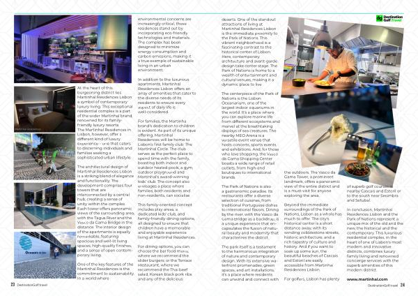 deserts . One of the standout attractions of living at Martinhal Residences Lisbon is the immediate proximity to the Park of Nations . This vibrant neighborhood is a fascinating contrast to the historical center of Lisbon . Here , contemporary architecture and avant-garde design take center stage . The Park of Nations is home to a wealth of entertainment and cultural venues , making it a dynamic place to live .