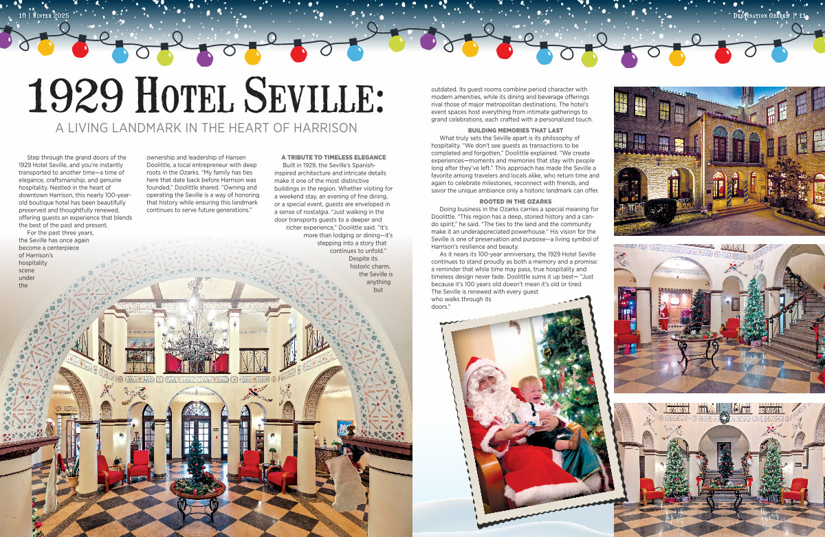 Doing business in the Ozarks carries a special meaning for Doolittle.“ This region has a deep, storied history and a cando spirit,” he said.“ The ties to the land and the community make it an underappreciated powerhouse.” His vision for the Seville is one of preservation and purpose— a living symbol of Harrison’ s resilience and beauty.