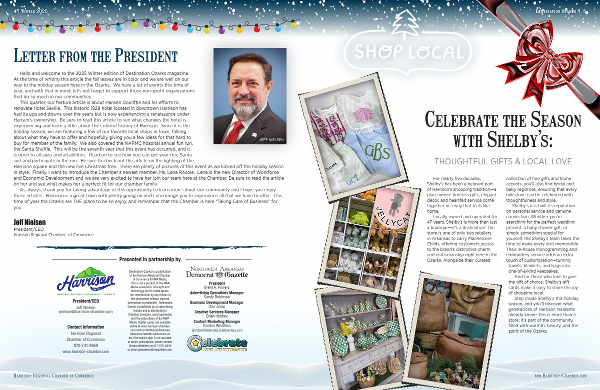 This quarter, our feature article is about Hansen Doolittle and his efforts to renovate Hotel Seville. This historic 1929 hotel located in downtown Harrison has had its ups and downs over the years but is now experiencing a renaissance under Hansen’ s ownership. Be sure to read this article to see what changes the hotel is experiencing and learn a little about the colorful history of Harrison. Since it is the holiday season, we are featuring a few of our favorite local shops in town, talking about what they have to offer and hopefully giving you a few ideas for that hard to buy for member of the family. We also covered the NARMC hospital annual fun run, the Santa Shuffle. This will be the seventh year that this event has occurred, and it is open to all ages and all abilities. Read on to see how you can get your free Santa suit and participate in the run. Be sure to check out the article on the lighting of the Harrison square and the new live Christmas tree. There are plenty of pictures of this event as we kicked off the holiday season in style. Finally, I want to introduce the Chamber’ s newest member, Ms. Lena Rocole. Lena is the new Director of Workforce and Economic Development and we are very excited to have her join our team here at the Chamber. Be sure to read the article on her and see what makes her a perfect fit for our chamber family.