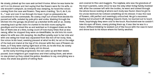 He slowly, picked up the vase and carried it home. When he was home he set it on his dresser and lied saying that the flowers were for his wife, so she wouldn’t complain. As everyone was sleeping, he heard the voices coming from the vase and flowers. They were chanting, “Do it, do it, do it....” over and over it ran through his head. It got so unbearable he succumbed to the commands. He slowly crept out of bed from beside his passed out wife, sedated by pain pills and vodka. Walking through the kitchen into the garage, he picked up a butcher knife and an ax. Slowly sneaking back up the stairs he started in the kids room saying his goodbyes and he raised the ax and watched as it dropped down on the two of them one at a time, losing count of how many times that ax was swung. After he stopped they were un-identifiable, he slid into his room where his wife was still sleeping. He shuffled quietly over to her side and with one swing her head was separated from the rest of her body. Now, the voices in his head, seeming pleased at what he did, he sat on the edge of the bed and stared at the top of his dresser with the vase of flowers on them, as if they were staring right back at him. As he did that, he slowly raised his butcher knife and slowly slit his throat.