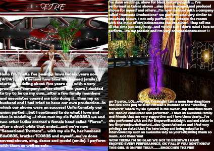 Hello I’m TrieXa I’ve been on Imvu for six years now (WOW)…can’t believe how time has passed (smile). I started modeling about five years ago with a very prestigious company…after about two years I decided to try to be on my own…after a few family members and associates coaxed me into doing it…then my ex husband and I had tried to have our own production…in which our shows were an success! Unfortunately our union parted …but I continued to do what I love and that is modeling …I then met my sis Fs890853 we and two other ladies started a female band called “Fierce”…after a short while that ended…and we’re now “Sensational Trotters”… with my sis Fs, her husband Edu0835, brother TC0835 and myself…we’ve done several shows, sing, dance and model (smile). I perform with them as well as solo…