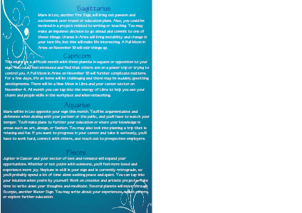 Mars in Leo, another Fire Sign, will bring out passion and excitement over travel or education plans. Also, you could be involved in a project related to writing or teaching. You may make an impulsive decision to go ahead and commit to one of these things. Uranus in Aries will bring instability and change in your love life, but this will make life interesting. A Full Moon in Aries on November 18 will stir things up.