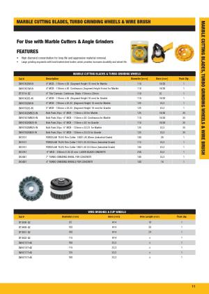 MARBLE CUTTING BLADES & TURBO GRINDING WHEELS Cat # Description Diameter ( mm ) Bore ( mm ) Pack Qty . DW47402M-IN 4 " MCB - 110mm x 20 ( Segment Height 10 mm ) for Marble 110 16 / 20 1 DW47401M-IN 4 " MCB - 110mm x 20 Continuous ( Segment Height 9 mm ) for Marble 110 16 / 20 1 DT3714-QZ 4 " Tile / Cermaic Continous Blade 110mm x 20mm 110 20 1 DW47402G-IN 4 " MCB - 110mm x 20 ( Segment Height 10 mm ) for Granite 110 16 / 20 1 DW47502M-IN 5 " MCB - 125mm x 22.23 ( Segment Height 10 mm ) for Marble 125 22,2 1 DW47502G-IN 5 " MCB - 125mm x 22.23 ( Segment Height 10 mm ) for Granite 125 22,2 1 DW47402MB25-IN Bulk Pack 25pc -4 " MCB - 110mm x 20 for Marble 125 16 / 20 25 DW47401MB25-IN Bulk Pack 25pc -4 " MCB - 110mm x 20 Continuous for Marble 110 16 / 20 25 DW47402GB25-IN Bulk Pack 25pc -4 " MCB - 110mm x 20 for Granite 110 16 / 20 25 DW47502MB25-IN Bulk Pack 25pc -5 " MCB - 125mm x 22.23 for Marble 125 22,2 25 DW47502GB25-IN Bulk Pack 25pc -5 " MCB - 125mm x 22.23 for Granite 125 22,2 25 DX3101 PORCELAIN TILES Thin Cutter 100X1.2X 20mm ( Industrial Grade ) 100 20 1 DX3121 PORCELAIN TILES Thin Cutter 115X1.2X 22.23mm ( Industrial Grade ) 115 22,2 1 DX3161 PORCELAIN TILES Thin Cutter 180X1.4X 22.23mm ( Industrial Grade ) 180 22,2 1 DX3781 9 " MCB - 230mm X 22.23 mm- LASER BLADE CONCRETE 230 22,2 1 DX4061 7 " TURBO GRINDING WHEEL FOR CONCRETE 180 22,2 1 DX4001 4 " TURBO GRINDING WHEELS FOR CONCRETE 100 16 1