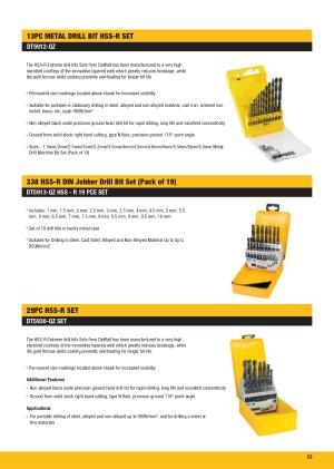 The HSS-R Extreme drill bits Sets from DeWalt has been manufactured to a very high standard courtesy of the innovative tapered web which greatly reduces breakage , while the gold ferrous oxide coating prevents overheating for longer bit life