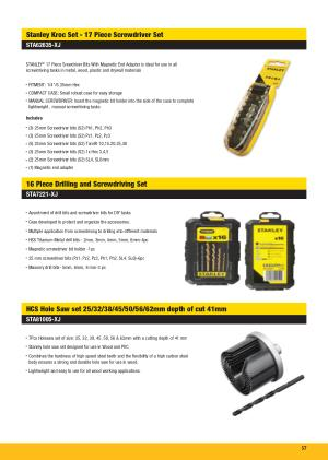 7Pcs Holesaw set of size : 25 , 32 , 38 , 45 , 50 , 56 & 62mm with a cutting depth of 41 mm Stanley hole saw set designed for use in Wood and PVC .
