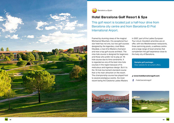 Framed by stunning views of the magical Montserrat Mountain, this exceptional fourstar hotel has not one, but two golf courses designed by the legendary José María Olazábal, a two-time Masters champion and now a top golf course architect. The nine-hole course is designed for beginners and those who prefer not to play an 18- hole course due to time constraints. It is regarded as one of the best nine-hole courses in the region because of its meticulous and ingenious design. But it is the 18-hole tournament-standard course that is the main attraction on the resort. The championship course has played host to several prestigious events, the most recent being the Catalonia Ladies Masters in 2007, part of the Ladies European Tour circuit. Excellent amenities are on offer, with two Mediterranean restaurants, three swimming pools, a wellness centre and a large range of local wineries that complement the golf experience close to the lively city of Barcelona.