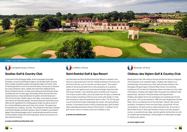 In the heart of the Dordogne Valley, at the crossroads of the Midi- Pyrénées, Limousin and Perigord regions, the Souillac Golf & Country Club is ideally situated to explore this beautiful region of France. Here, the landscape tells of a rich and colourful history, inviting you to discover the many prehistoric caves, castles and charming medieaval towns. Plenty of opportunity too, to enjoy some delicious local food and wines. Founded just over 10 years ago, the Souillac Golf & Country Club has rapidly become a choice destination for golfers of all skill levels and from all over Europe. Hidden away in the valley, surrounded by ancient oak forest and impressive gorges, this picturesque but technical course offers all the ingredients for a riveting game of golf, as well as some of the most breathtaking views you ' ll ever come across. The greens are immaculate and, in places, very fast. The ambiance at the club is relaxed and friendly( English and Dutch spoken). Accommodation is provided in elegant free-standing lodges, built in small hamlets around the course. Further facilities include nine swimming pools, tennis courts and an onsite restaurant and bar.