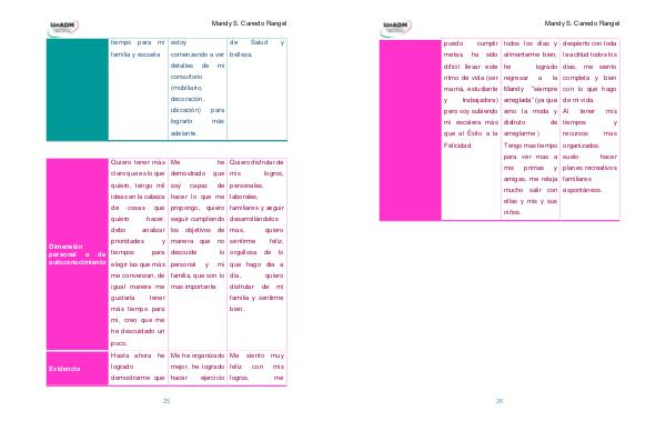 Mandy S. Canedo Rangel puedo cumplir metas, ha sido difícil llevar este ritmo de vida( ser mamá, estudiante y trabajadora) pero voy subiendo mi escalera más que al Éxito a la Felicidad. todos los días y alimentarme bien, he logrado regresar a la Mandy“ siempre arreglada”( ya que amo la moda y disfruto de arreglarme) Tengo mas tiempo para ver mas a mis primas y amigas, me relaja mucho salir con ellas y mis y sus niños. despierto con toda la actitud todos los dias, me siento completa y bien con lo que hago de mi vida. Al tener mis tiempos y recursos mas organizados, suelo hacer planes recreativos familiares espontáneos.