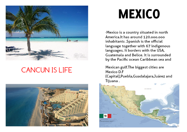 ·Mexico is a country situated in north America.It has around 120.ooo.ooo inhabitants .Spanish is the official language together with 67 indigenous languages. It borders with the USA, Guatemala and Belice. It is surrounded by the Pacific ocean Caribbean sea and by the