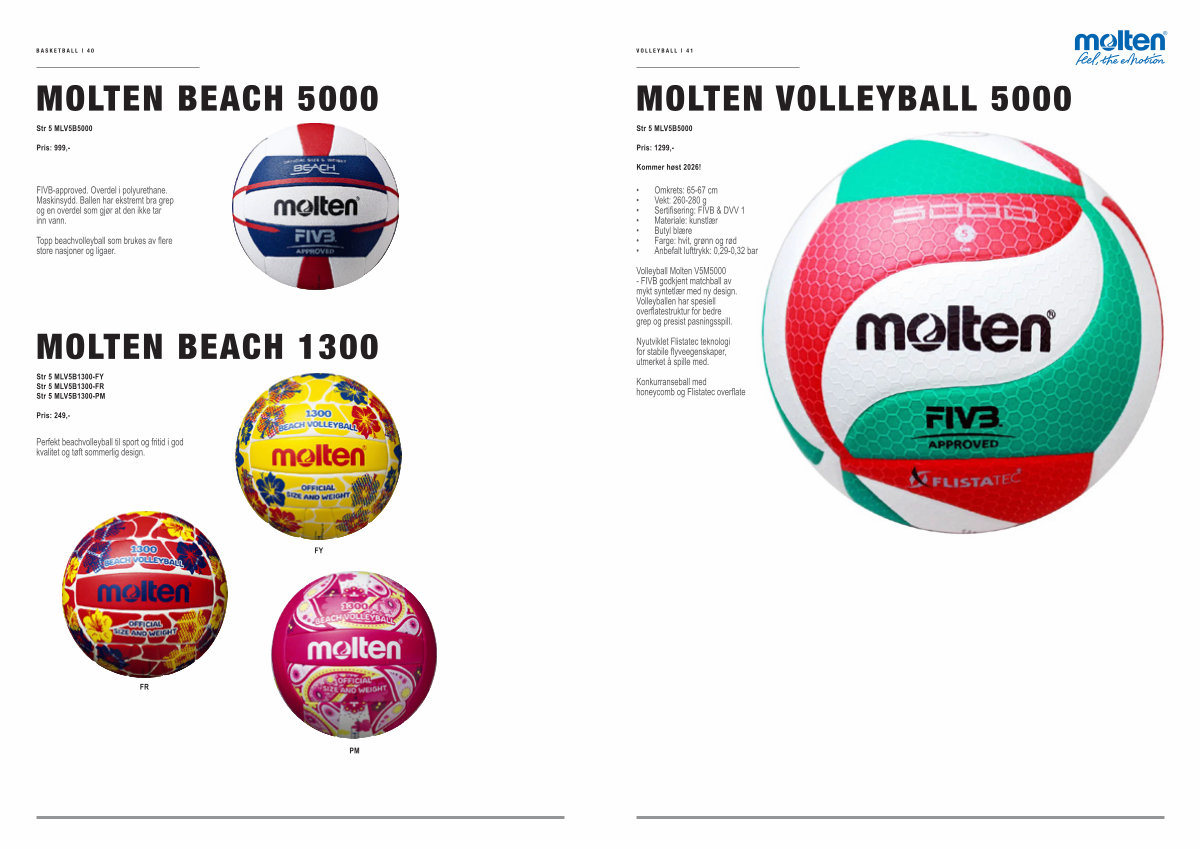 Volleyball Molten V5M5000- FIVB godkjent matchball av mykt syntetlær med ny design. Volleyballen har spesiell overflatestruktur for bedre grep og presist pasningsspill.