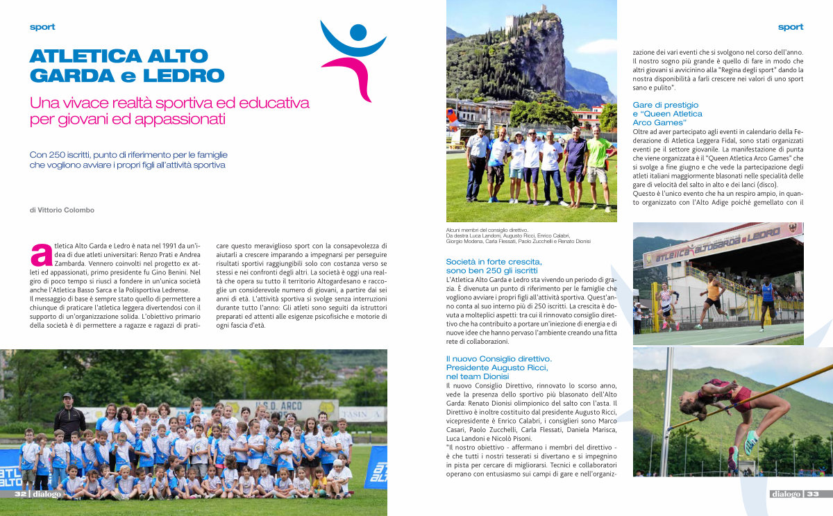 Società in forte crescita, sono ben 250 gli iscritti L’ Atletica Alto Garda e Ledro sta vivendo un periodo di grazia. È divenuta un punto di riferimento per le famiglie che vogliono avviare i propri figli all’ attività sportiva. Quest’ anno conta al suo interno più di 250 iscritti. La crescita è dovuta a molteplici aspetti: tra cui il rinnovato consiglio direttivo che ha contribuito a portare un’ iniezione di energia e di nuove idee che hanno pervaso l’ ambiente creando una fitta rete di collaborazioni.