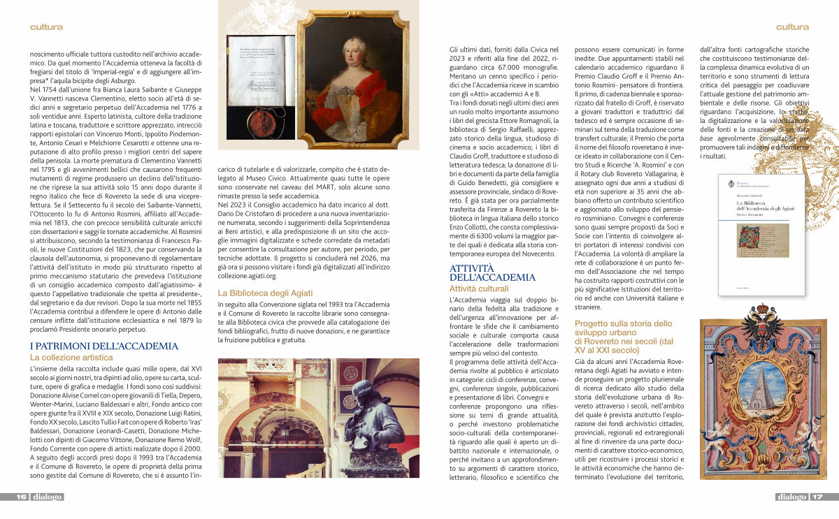 noscimento ufficiale tuttora custodito nell’ archivio accademico. Da quel momento l’ Accademia otteneva la facoltà di fregiarsi del titolo di‘ Imperial-regia’ e di aggiungere all’ impresa * l’ aquila bicipite degli Asburgo. Nel 1754 dall’ unione fra Bianca Laura Saibante e Giuseppe V. Vannetti nasceva Clementino, eletto socio all’ età di sedici anni e segretario perpetuo dell’ Accademia nel 1776 a soli ventidue anni. Esperto latinista, cultore della tradizione latina e toscana, traduttore e scrittore apprezzato, intrecciò rapporti epistolari con Vincenzo Monti, Ippolito Pindemonte, Antonio Cesari e Melchiorre Cesarotti e ottenne una reputazione di alto profilo presso i migliori centri del sapere della penisola. La morte prematura di Clementino Vannetti nel 1795 e gli avvenimenti bellici che causarono frequenti mutamenti di regime produssero un declino dell’ Istituzione che riprese la sua attività solo 15 anni dopo durante il regno italico che fece di Rovereto la sede di una viceprefettura. Se il Settecento fu il secolo dei Saibante-Vannetti, l’ Ottocento lo fu di Antonio Rosmini, affiliato all’ Accademia nel 1813, che con precoce sensibilità culturale arricchì con dissertazioni e saggi le tornate accademiche. Al Rosmini si attribuiscono, secondo la testimonianza di Francesco Paoli, le nuove Costituzioni del 1823, che pur conservando la clausola dell’ autonomia, si proponevano di regolamentare l’ attività dell’ istituto in modo più strutturato rispetto al primo meccanismo statutario che prevedeva l’ istituzione di un consiglio accademico composto dall’ agiatissimo- è questo l’ appellativo tradizionale che spetta al presidente-, dal segretario e da due revisori. Dopo la sua morte nel 1855 l’ Accademia contribuì a difendere le opere di Antonio dalle censure inflitte dall’ istituzione ecclesiastica e nel 1879 lo proclamò Presidente onorario perpetuo.