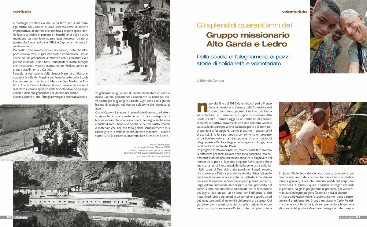 è d’ obbligo ricordare ciò che lui ha fatto per la sua terra. Egli affitta dal Comune di Arco seicento ettari di terreno improduttivo, di pietraie e le bonifica a proprie spese, dando lavoro a decine di persone e i fianchi verdi delle nostre montagne testimoniano adesso quest’ impresa. Vicino al ponte sulla Sarca realizza le Officine Caproni, strutturate in modo moderno. Da quello stabilimento uscirà il“ Capriolo”, moto che all’ e- poca vinceva trofei e gare nazionali e internazionali. Pensa anche ad una produzione alternativa con il Calzaturificio e poi con la Resina. Erano tanti, tanti posti di lavoro, famiglie che tornavano a vivere decorosamente. Realizza anche un grande stabilimento a Gardolo. Finanzia la costruzione della Scuola Materna di Massone; acquista la villa de Angelini per farne la sede della Scuola Elementare per i bambini di Massone, San Martino e Moletta. Con il fratello Federico dona il terreno su cui verrà realizzato il campo sportivo della Società Stivo. Sono segni concreti della sua generosità che durano nel tempo. Gianni Caproni e i suoi famigliari vengono ricordati alle nuove generazioni agli alunni di quinta elementare in visita al Bosco Caproni, percorrendo i sentieri che lui, bambino, aveva risalito per raggiungere Carobbi. Ogni anno è una grande lezione di ecologia, nel ricordo dell’ uomo che piantava gli alberi. Gianni Caproni è stato un imprenditore illuminato ed attento ai problemi sociali a cui ha cercato di dare una risposta. La lezione morale che con la sua opera consegna anche a noi è quello di fare il bene non perché se ne trae frutto( morale o materiale che sia), ma farlo perché semplicemente lo si ritiene giusto, perché lo hanno dettato la mente, il cuore e soprattutto la coscienza, insomma fare il bene per il bene.