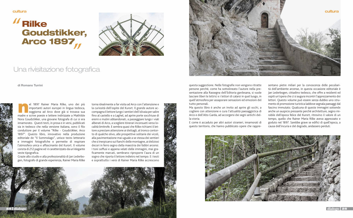 questa suggestione. Nelle fotografie non vengono ritratte persone perché, come ha sottolineato l’ autore nella presentazione alla Rassegna dell’ Editoria gardesana, si vuole lasciare liberi le lettrici e i lettori di calarsi in quel luogo, in quell’ atmosfera per assaporare sensazioni ed emozioni del tutto personali. Ma questo libro è anche un invito ad aprire gli occhi, a cogliere con attenzione e cura l’ attualità paesaggistica di Arco e dell’ Alto Garda, ad accorgersi dei segni antichi della storia. E come è accaduto per altri autori stranieri, innamorati di questo territorio, che hanno pubblicato opere che rappresentano pietre miliari per la conoscenza delle peculiarità dell’ ambiente arcense, in questa occasione editoriale è Jan Lederbogen, cittadino tedesco, che offre a residenti ed ospiti un’ opera che ci si augura incontri l’ apprezzamento dei lettori. Questo volume può essere senza dubbio uno strumento di promozione turistica laddove segnala paesaggi dal fascino immutato. Qualcuna di queste immagini sottende anche un auspicio pressante perché architetture, segno mirabile dell’ epoca felice del Kurort, ritrovino il valore di un tempo, quello che Rainer Maria Rilke aveva apprezzato e goduto nel 1897. Sarebbe grave se edifici di quell’ epoca, a causa dell’ incuria e del degrado, andassero perduti.