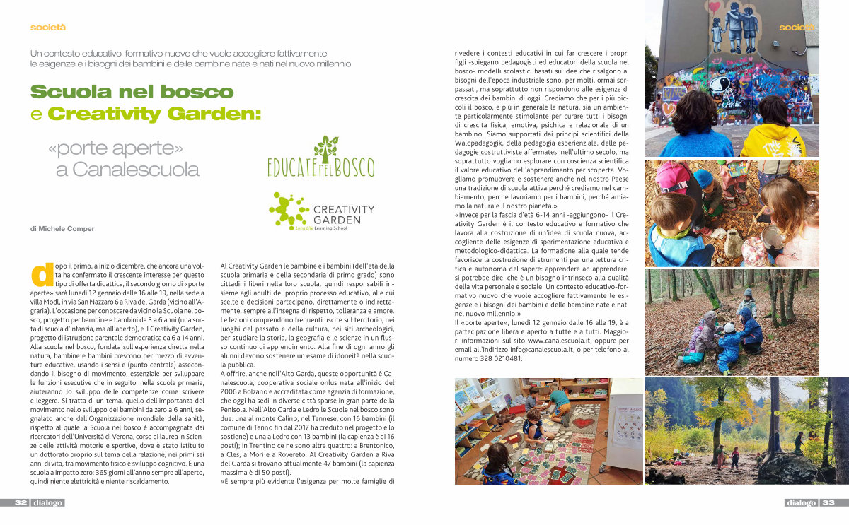 Al Creativity Garden le bambine e i bambini( dell’ età della scuola primaria e della secondaria di primo grado) sono cittadini liberi nella loro scuola, quindi responsabili insieme agli adulti del proprio processo educativo, alle cui scelte e decisioni partecipano, direttamente o indirettamente, sempre all’ insegna di rispetto, tolleranza e amore. Le lezioni comprendono frequenti uscite sul territorio, nei luoghi del passato e della cultura, nei siti archeologici, per studiare la storia, la geografia e le scienze in un flusso continuo di apprendimento. Alla fine di ogni anno gli alunni devono sostenere un esame di idoneità nella scuola pubblica. A offrire, anche nell’ Alto Garda, queste opportunità è Canalescuola, cooperativa sociale onlus nata all’ inizio del 2006 a Bolzano e accreditata come agenzia di formazione, che oggi ha sedi in diverse città sparse in gran parte della Penisola. Nell’ Alto Garda e Ledro le Scuole nel bosco sono due: una al monte Calino, nel Tennese, con 16 bambini( il comune di Tenno fin dal 2017 ha creduto nel progetto e lo sostiene) e una a Ledro con 13 bambini( la capienza è di 16 posti); in Trentino ce ne sono altre quattro: a Brentonico, a Cles, a Mori e a Rovereto. Al Creativity Garden a Riva del Garda si trovano attualmente 47 bambini( la capienza massima è di 50 posti). « È sempre più evidente l’ esigenza per molte famiglie di