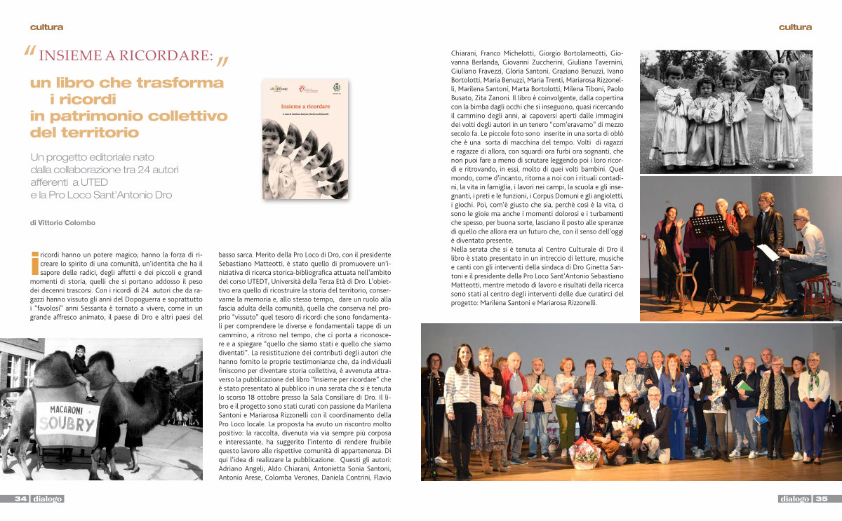 ricordi hanno un potere magico; hanno la forza di ricreare lo spirito di una comunità, un’ identità che ha il sapore delle radici, degli affetti e dei piccoli e grandi momenti di storia, quelli che si portano addosso il peso dei decenni trascorsi. Con i ricordi di 24 autori che da ragazzi hanno vissuto gli anni del Dopoguerra e soprattutto i“ favolosi” anni Sessanta è tornato a vivere, come in un grande affresco animato, il paese di Dro e altri paesi del