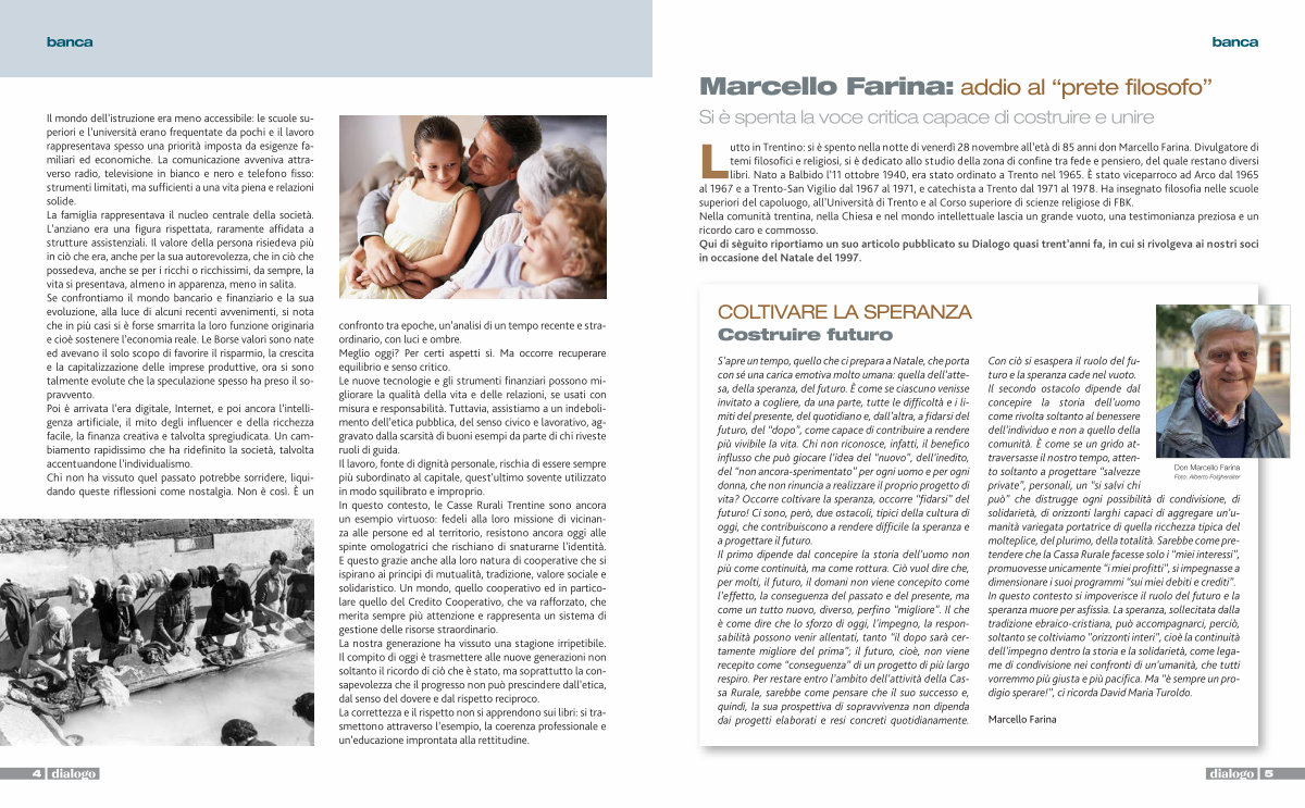 Il mondo dell’ istruzione era meno accessibile: le scuole superiori e l’ università erano frequentate da pochi e il lavoro rappresentava spesso una priorità imposta da esigenze familiari ed economiche. La comunicazione avveniva attraverso radio, televisione in bianco e nero e telefono fisso: strumenti limitati, ma sufficienti a una vita piena e relazioni solide. La famiglia rappresentava il nucleo centrale della società. L’ anziano era una figura rispettata, raramente affidata a strutture assistenziali. Il valore della persona risiedeva più in ciò che era, anche per la sua autorevolezza, che in ciò che possedeva, anche se per i ricchi o ricchissimi, da sempre, la vita si presentava, almeno in apparenza, meno in salita. Se confrontiamo il mondo bancario e finanziario e la sua evoluzione, alla luce di alcuni recenti avvenimenti, si nota che in più casi si è forse smarrita la loro funzione originaria e cioè sostenere l’ economia reale. Le Borse valori sono nate ed avevano il solo scopo di favorire il risparmio, la crescita e la capitalizzazione delle imprese produttive, ora si sono talmente evolute che la speculazione spesso ha preso il sopravvento. Poi è arrivata l’ era digitale, Internet, e poi ancora l’ intelligenza artificiale, il mito degli influencer e della ricchezza facile, la finanza creativa e talvolta spregiudicata. Un cambiamento rapidissimo che ha ridefinito la società, talvolta accentuandone l’ individualismo. Chi non ha vissuto quel passato potrebbe sorridere, liquidando queste riflessioni come nostalgia. Non è così. È un confronto tra epoche, un’ analisi di un tempo recente e straordinario, con luci e ombre. Meglio oggi? Per certi aspetti sì. Ma occorre recuperare equilibrio e senso critico. Le nuove tecnologie e gli strumenti finanziari possono migliorare la qualità della vita e delle relazioni, se usati con misura e responsabilità. Tuttavia, assistiamo a un indebolimento dell’ etica pubblica, del senso civico e lavorativo, aggravato dalla scarsità di buoni esempi da parte di chi riveste ruoli di guida. Il lavoro, fonte di dignità personale, rischia di essere sempre più subordinato al capitale, quest’ ultimo sovente utilizzato in modo squilibrato e improprio. In questo contesto, le Casse Rurali Trentine sono ancora un esempio virtuoso: fedeli alla loro missione di vicinanza alle persone ed al territorio, resistono ancora oggi alle spinte omologatrici che rischiano di snaturarne l’ identità. E questo grazie anche alla loro natura di cooperative che si ispirano ai principi di mutualità, tradizione, valore sociale e solidaristico. Un mondo, quello cooperativo ed in particolare quello del Credito Cooperativo, che va rafforzato, che merita sempre più attenzione e rappresenta un sistema di gestione delle risorse straordinario. La nostra generazione ha vissuto una stagione irripetibile. Il compito di oggi è trasmettere alle nuove generazioni non soltanto il ricordo di ciò che è stato, ma soprattutto la consapevolezza che il progresso non può prescindere dall’ etica, dal senso del dovere e dal rispetto reciproco. La correttezza e il rispetto non si apprendono sui libri: si trasmettono attraverso l’ esempio, la coerenza professionale e un’ educazione improntata alla rettitudine.