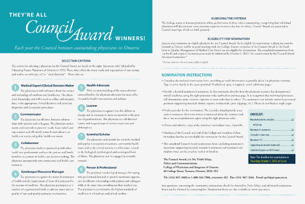 The College wants to honour physicians whose performance in these roles is outstanding, recognizing that individual